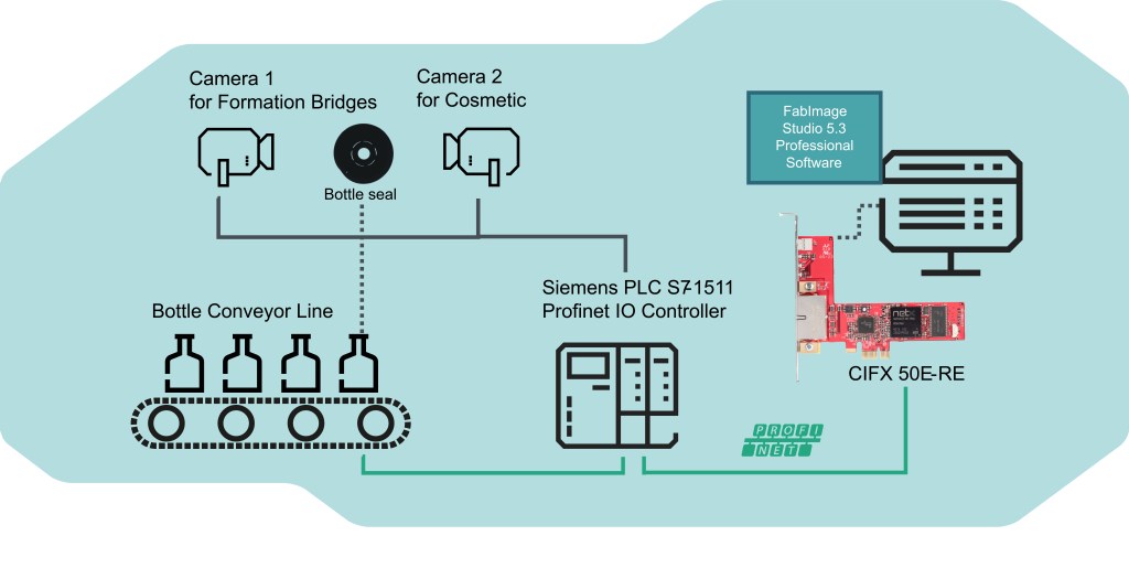La soluzione consiste in un PC desktop convenzionale con processore i7 e 32 GB di RAM, collegato a due telecamere tramite cavo LAN ed Ethernet classico. Queste telecamere forniscono le immagini per l’ispezione visiva dei contenitori farmaceutici sul sistema di trasporto e verificano eventuali danni o difetti estetici sui tappi, come piegature, crepe, macchie o rughe. I dati delle immagini vengono elaborati con il software FabImage Studio 5.3 Professional. L’ultimo compito era stabilire un trasferimento di dati efficiente e affidabile in real-time tra il sistema PC basato su Ethernet e il PLC Siemens S7 tramite PROFINET IO, affinché il PLC potesse avviare l’espulsione delle fiale difettose. Questa fase ha presentato diverse sfide.